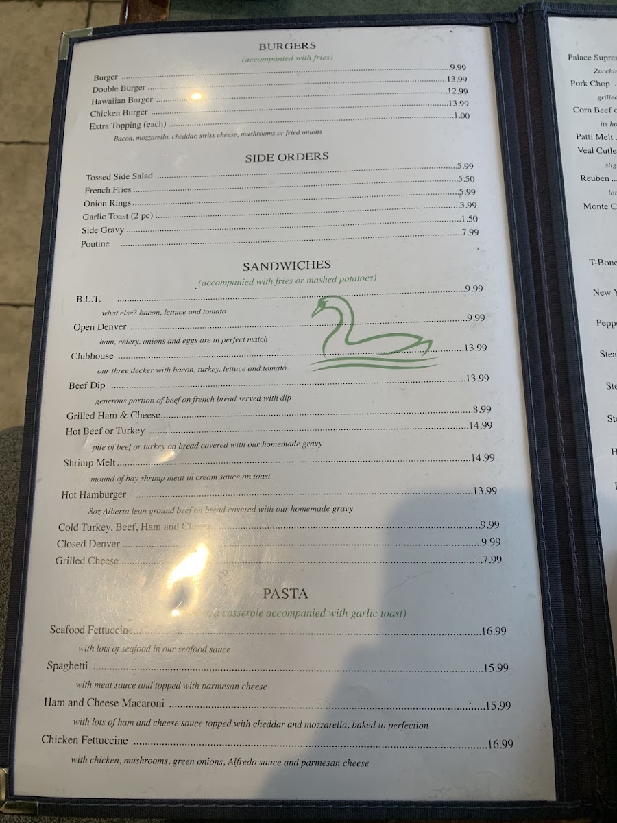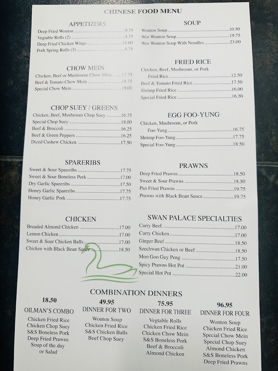 **About Swan Palace Restaurant**Nestled in the charming town of Swan Hills, Alberta, Swan Palace Restaurant is a delightful culinary gem that promises an exceptional dining experience. Known for its friendly service and a vast menu, the restaurant specializes in delicious homemade dishes, from savory burgers to authentic Chinese cuisine. Customers rave about the generous portions and quick service, making it a perfect stop for travelers and locals alike. The standout homemade soups and hearty specials, highlighted by rave reviews, showcase the restaurant's commitment to quality and flavor. A visit to Swan Palace is sure to satisfy any appetite and leave a lasting impression.